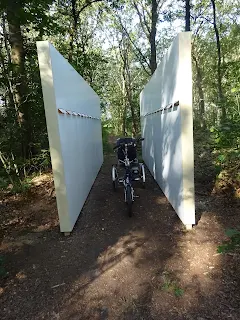 Tussen nr.15 en nr.16 een smal bospaadje, daar ben ik wel langs gefietst, kan lastig zijn advies is om daar de fietsroute te volgen.